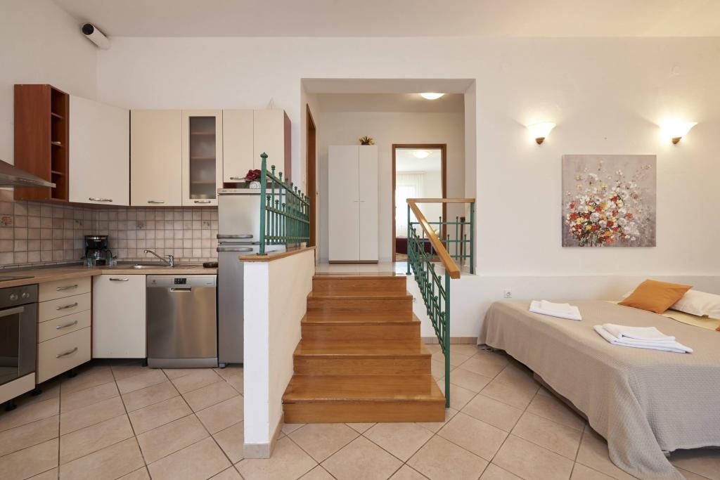 Apartment can accommodate 4 guests. Beds are situated in 1 sleeping rooms, but also in the living room, within 40m2. Guests can use a private terrace to enjoy the warm summer evenings. Food can be prepared using barbecue which is shared with other guests too. INCLUDED IN THE PRICE: tourist tax, final cleaning, air-conditioning, parking, internet, laundry, baby cot, iron, ironing board, hairdryer, sunchairs. The availability of additional services for your chosen dates of stay, as well as their prices (if none are listed) must be checked ahead of time. Any additional services not shown in the price calculation are payable directly to the property owner and only if used by the visitor.
