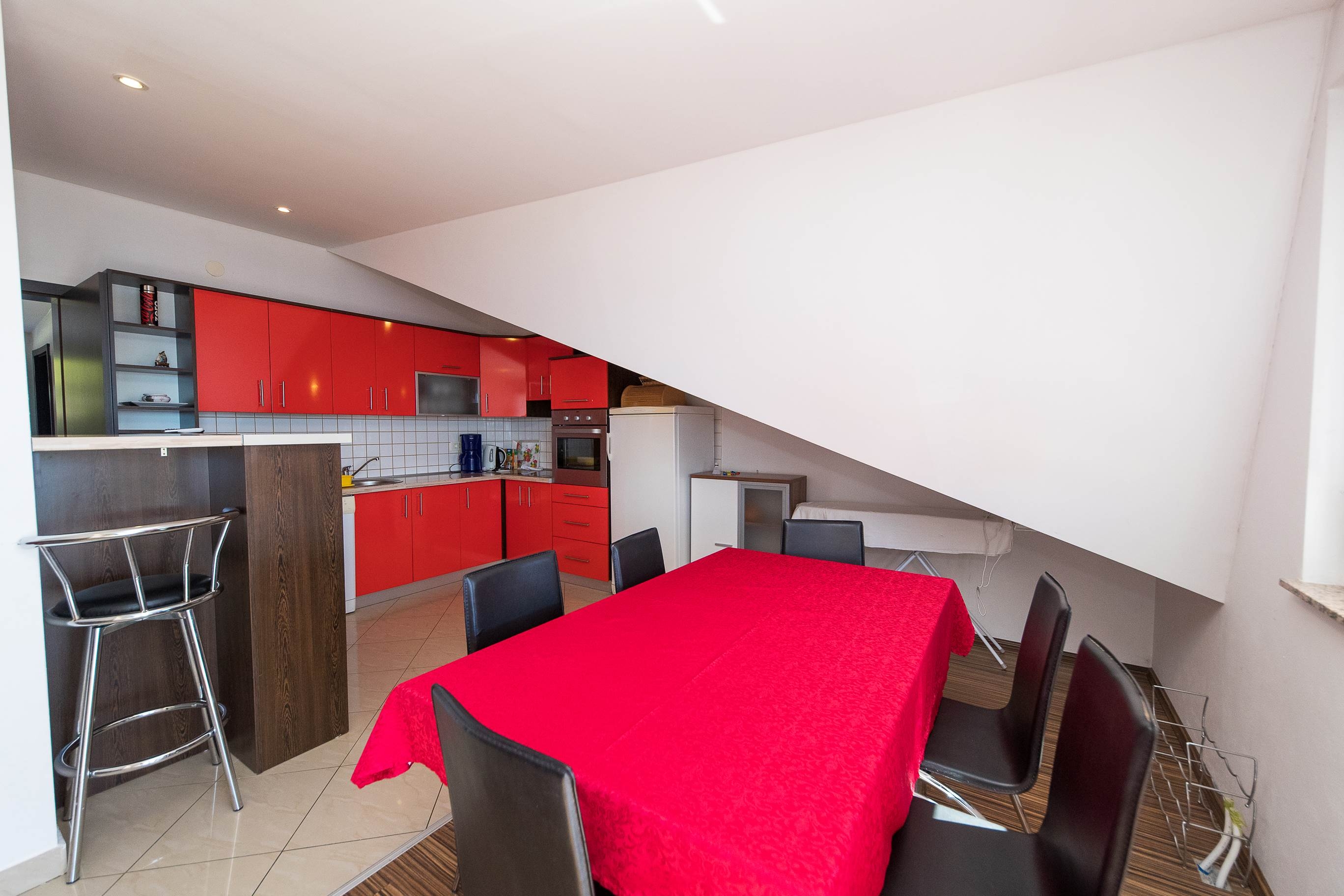 Apartment can accommodate 4 guests. Beds are situated in 1 sleeping rooms, but also in the living room, within 42m2. Guests can use a private terrace to enjoy the warm summer evenings. The apartment offers the sea view. Food can be prepared using barbecue which is shared with other guests too. Shared pool is on disposal during stay. INCLUDED IN THE PRICE: tourist tax, final cleaning, air-conditioning, central heating, pool, parking, internet, iron, ironing board, hairdryer. OBLIGATORY ADDITIONAL COSTS: short stay fee (surcharge depending on a number of booked nights: 30% - 1, 20% - 2, 10% - 3). OPTIONAL ADDITIONAL COSTS: laundry (€5.00 washing). The availability of additional services for your chosen dates of stay, as well as their prices (if none are listed) must be checked ahead of time. Any additional services not shown in the price calculation are payable directly to the property owner and only if used by the visitor.