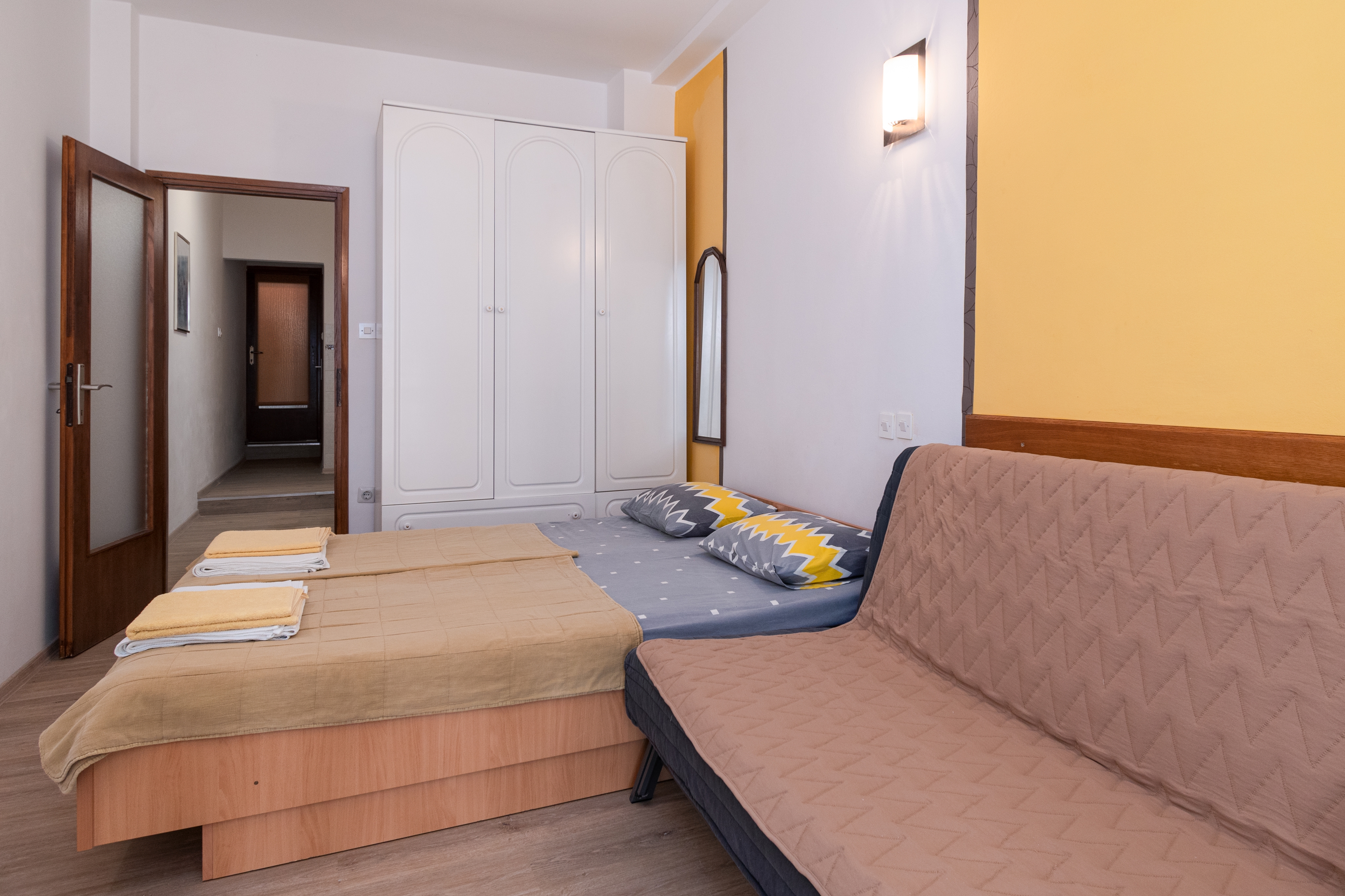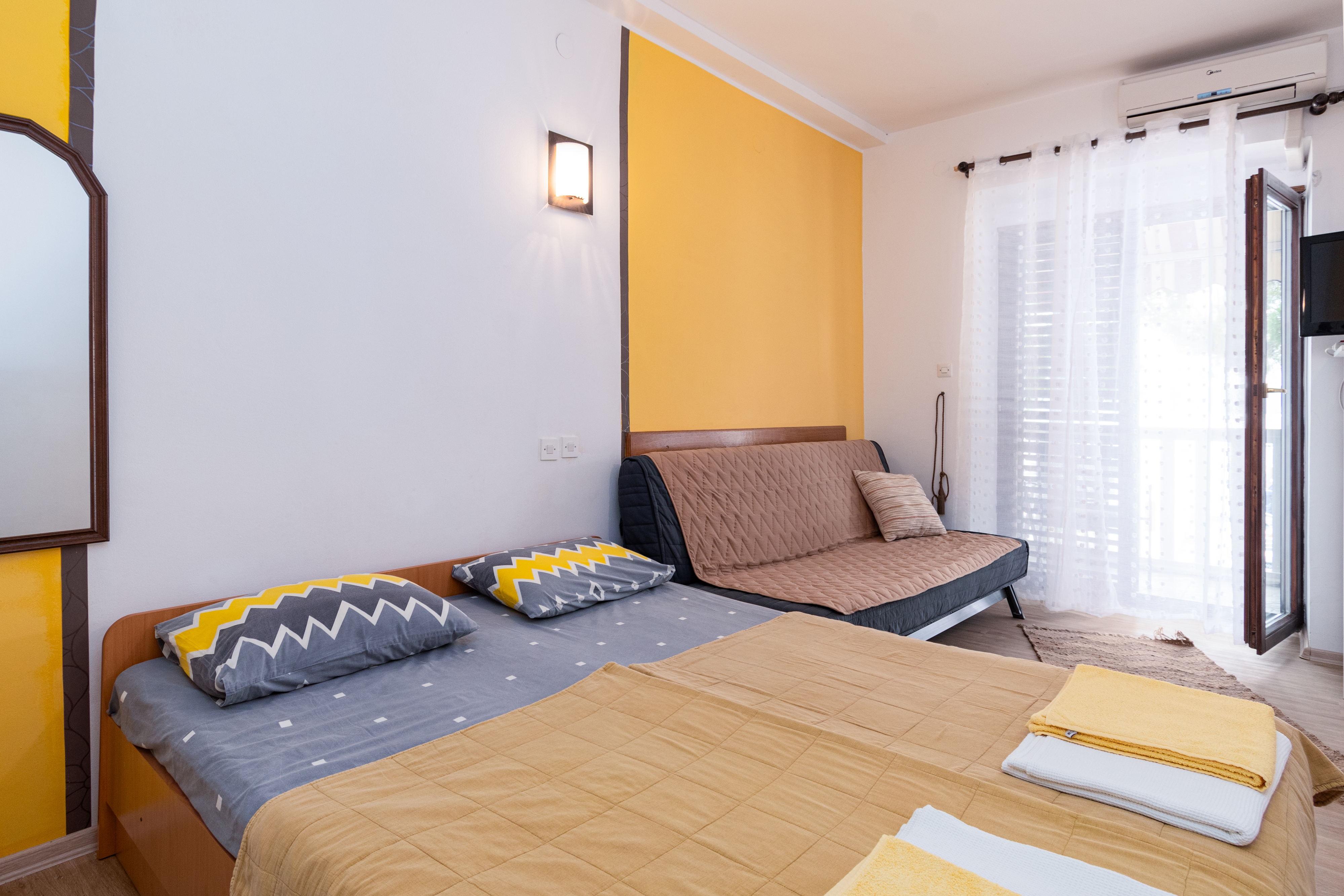 Apartment can accommodate 3 guests. Beds are situated in 1 sleeping rooms, within 24m2. Guests can use a private balcony to enjoy the warm summer evenings. The apartment offers the sea view. Food can be prepared using barbecue which is shared with other guests too. INCLUDED IN THE PRICE: tourist tax, final cleaning, air-conditioning, parking, internet, iron, ironing board, hairdryer. OBLIGATORY ADDITIONAL COSTS: short stay fee (surcharge depending on a number of booked nights: 30% - 1, 20% - 2, 10% - 3). The availability of additional services for your chosen dates of stay, as well as their prices (if none are listed) must be checked ahead of time. Any additional services not shown in the price calculation are payable directly to the property owner and only if used by the visitor.