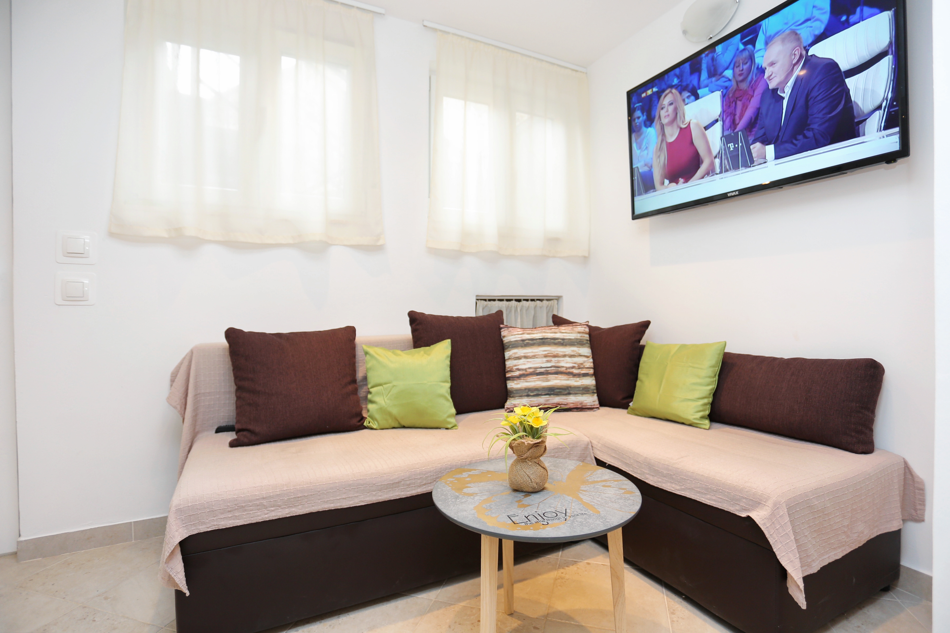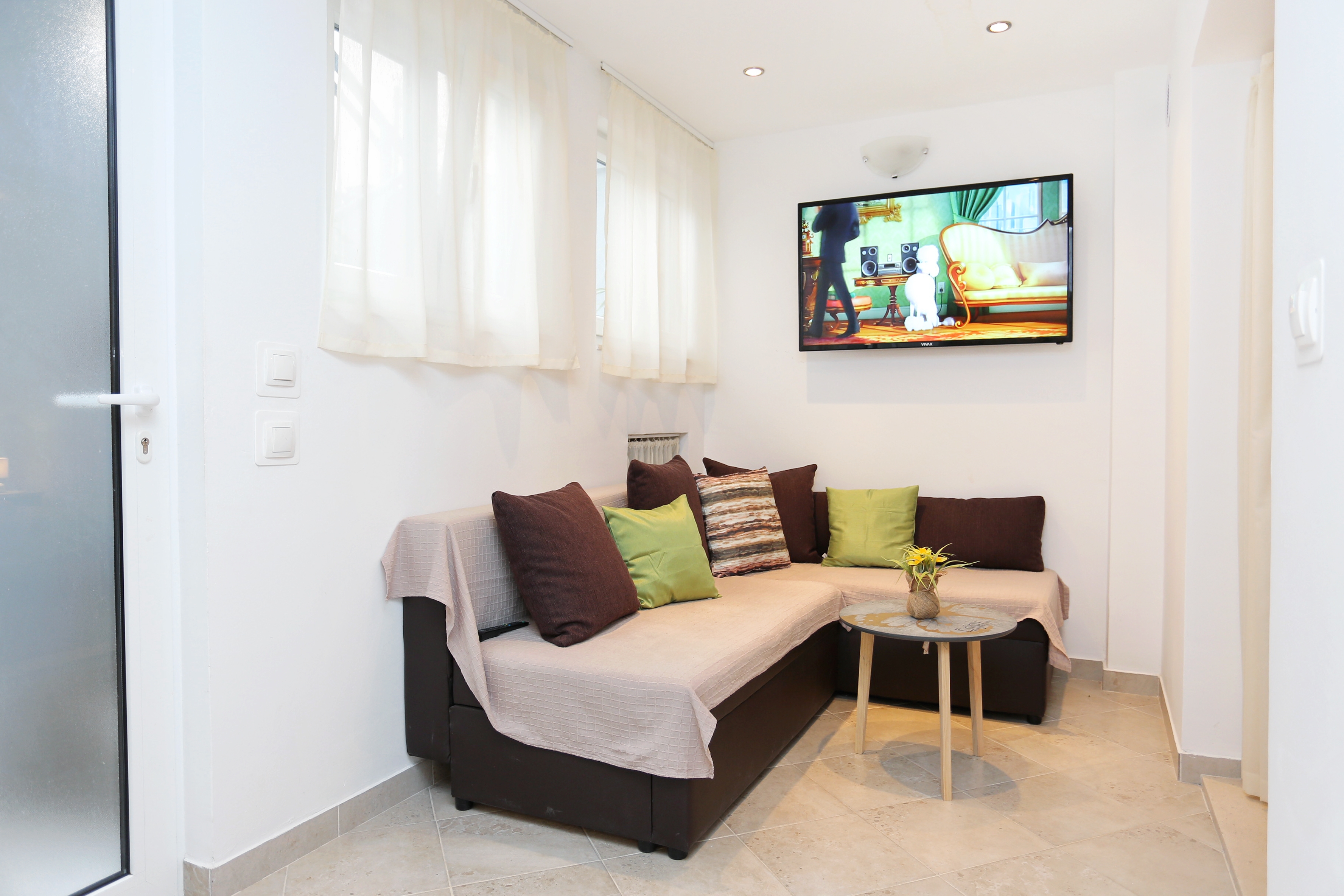 Studio flat can accommodate 2 guests. Beds are situated in 1 sleeping rooms, within 30m2. Guests can use a private terrace to enjoy the warm summer evenings. Other guests or hosts pass through the terrace of the booked accommodation unit. INCLUDED IN THE PRICE: tourist tax, final cleaning, air-conditioning, internet, iron, hairdryer. OBLIGATORY ADDITIONAL COSTS: short stay fee (surcharge depending on a number of booked nights: 30% - 1, 20% - 2, 10% - 3). OPTIONAL ADDITIONAL COSTS: laundry (€5.00 washing). The availability of additional services for your chosen dates of stay, as well as their prices (if none are listed) must be checked ahead of time. Any additional services not shown in the price calculation are payable directly to the property owner and only if used by the visitor.