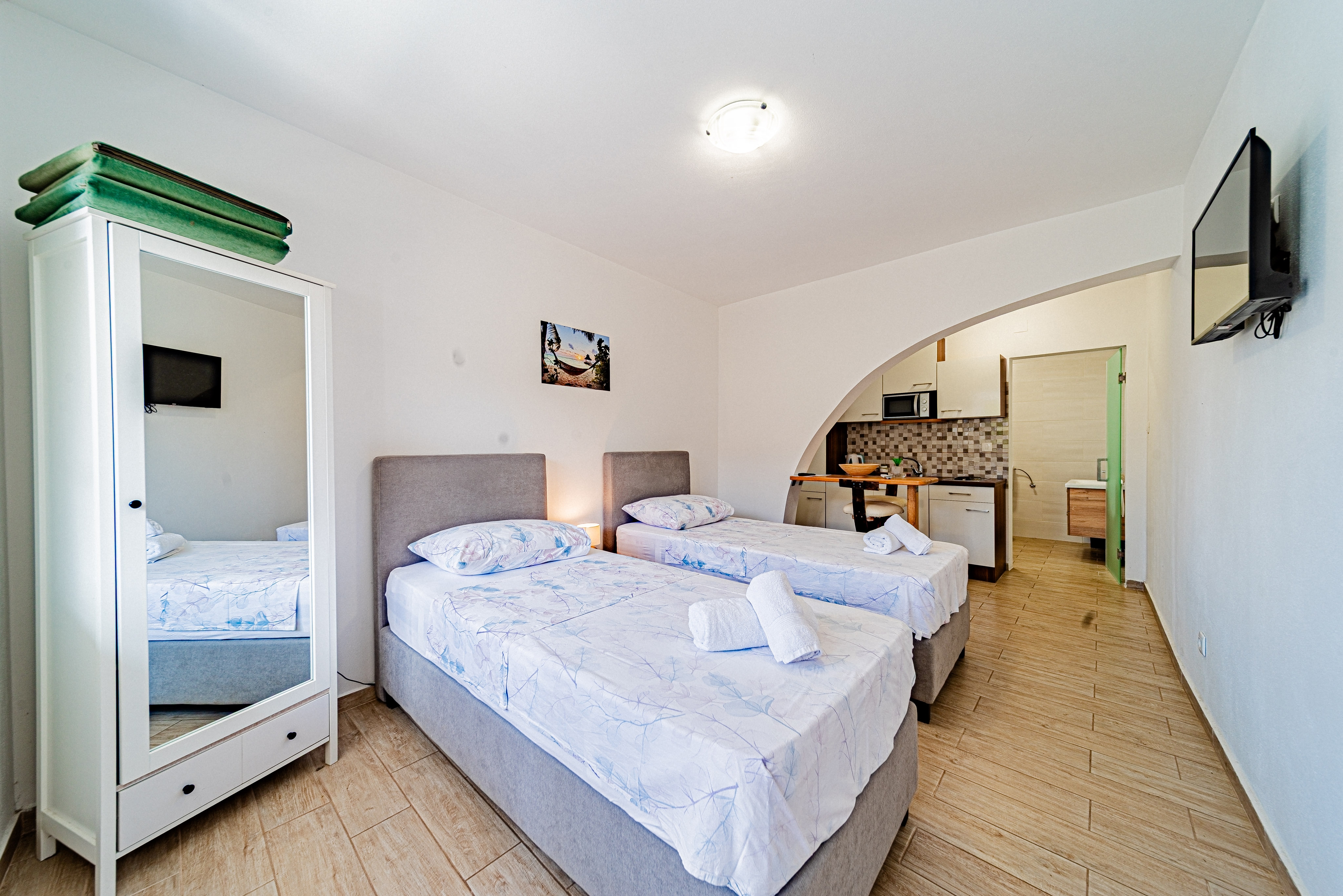 Studio flat can accommodate 2 guests. Beds are situated in 1 sleeping rooms, within 25m2. Guests can use a private terrace to enjoy the warm summer evenings. INCLUDED IN THE PRICE: tourist tax, final cleaning, air-conditioning, parking, internet, hairdryer. The availability of additional services for your chosen dates of stay, as well as their prices (if none are listed) must be checked ahead of time. Any additional services not shown in the price calculation are payable directly to the property owner and only if used by the visitor.