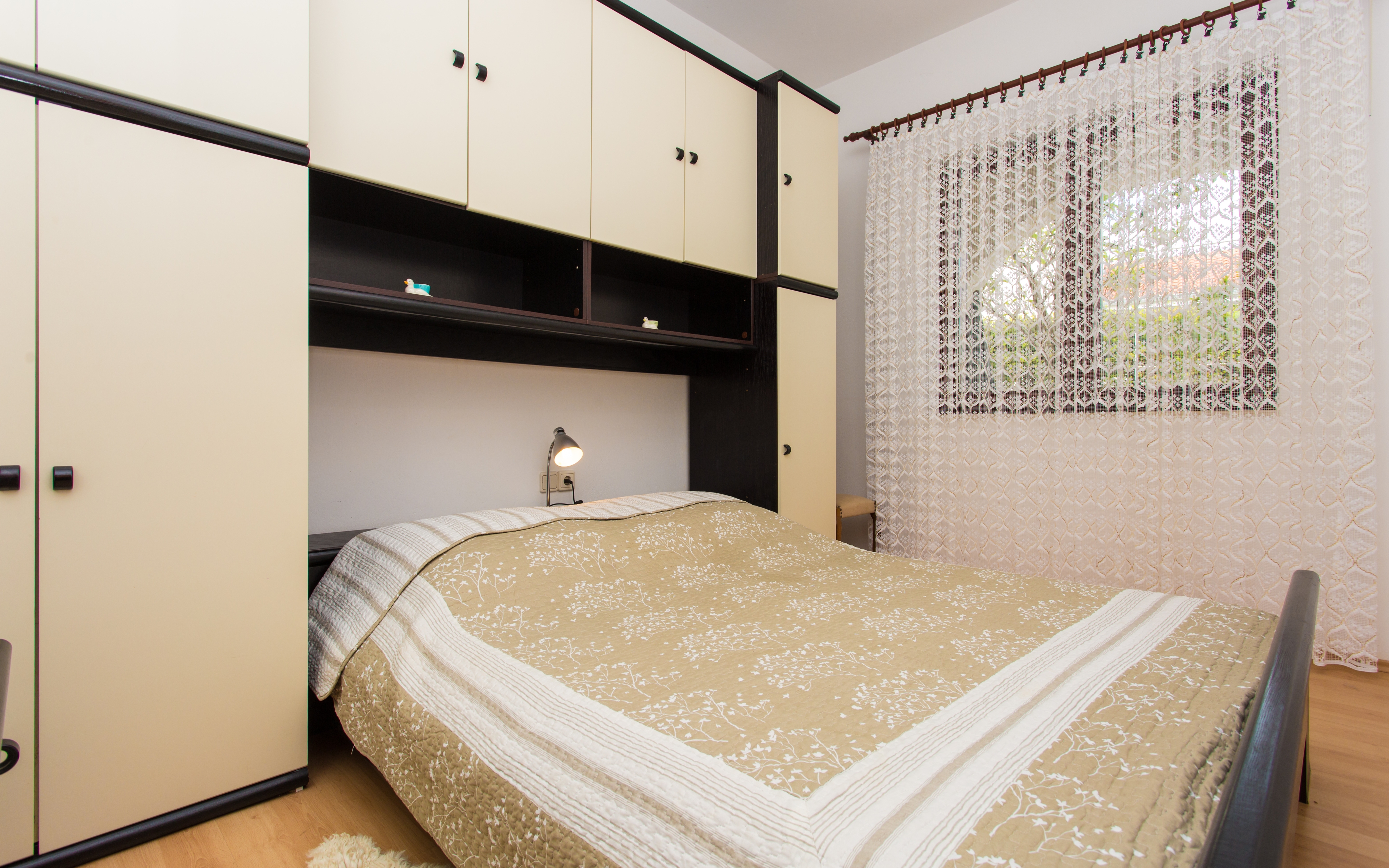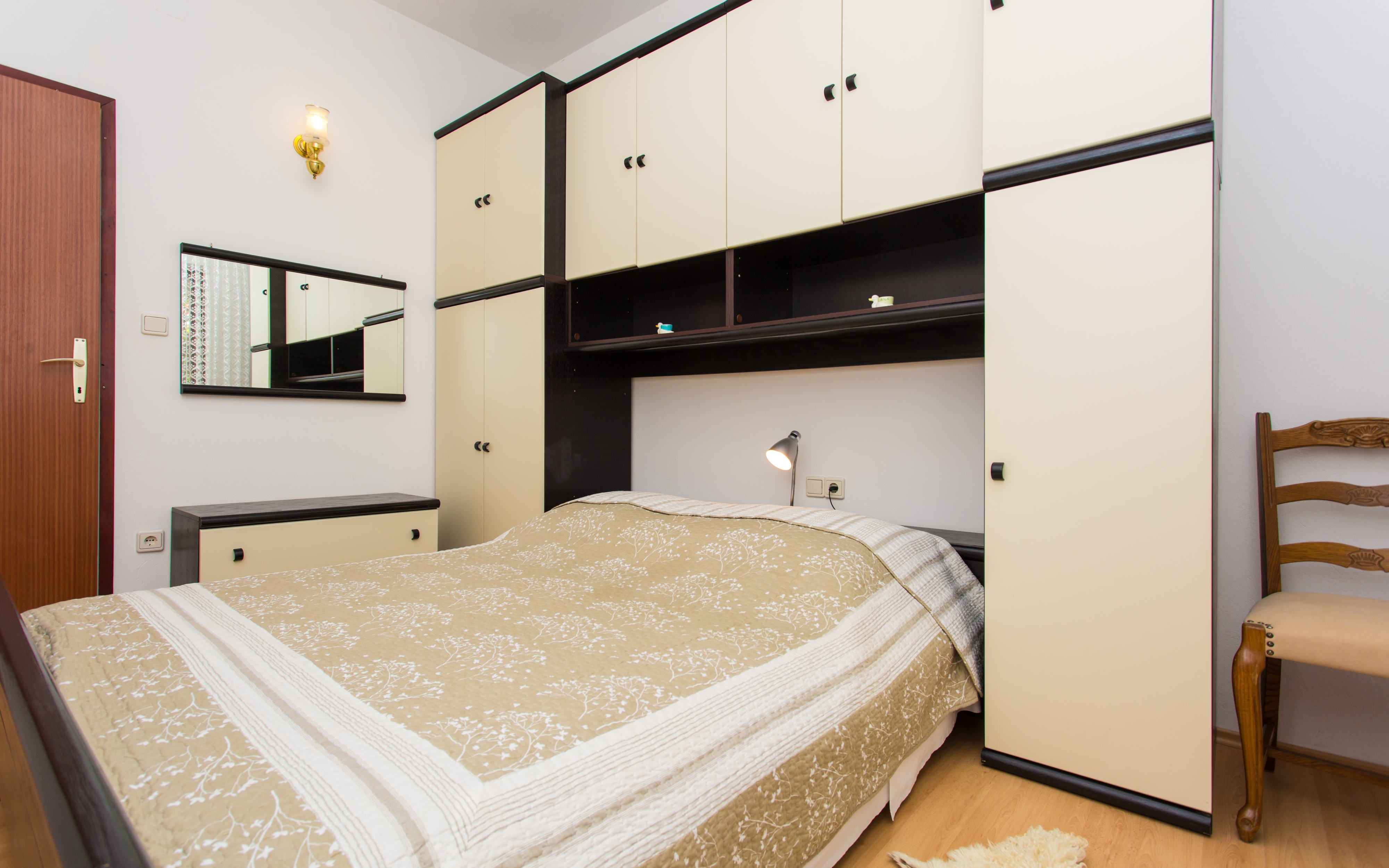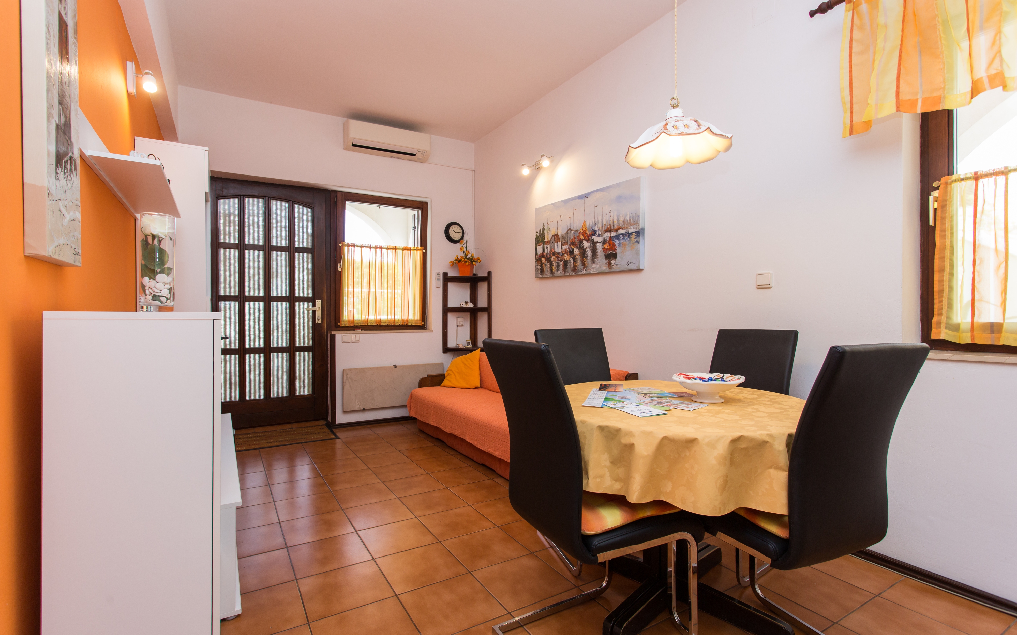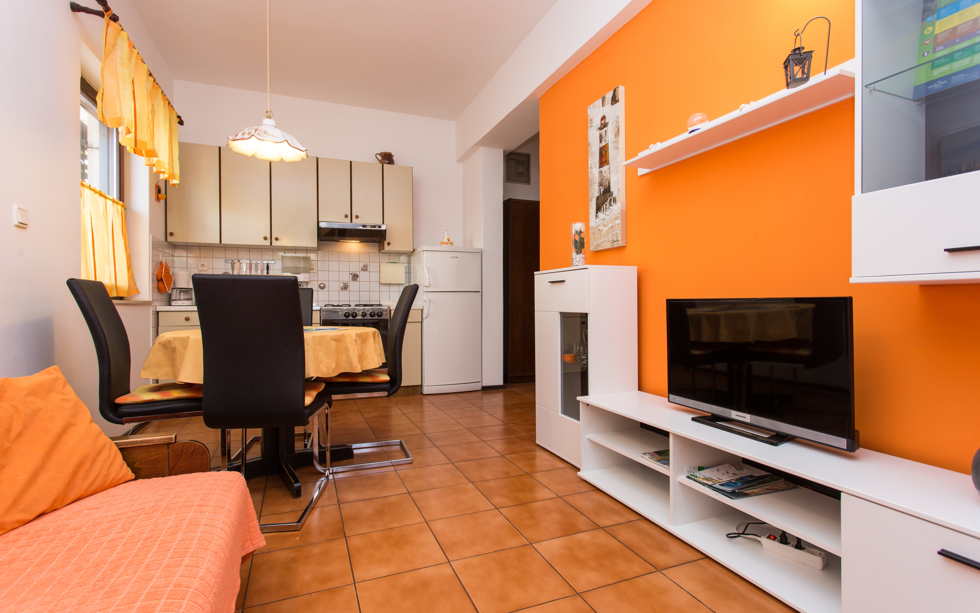 Apartment can accommodate 4 guests. Beds are situated in 1 sleeping rooms, but also in the living room, within 35m2. Guests can use a private terrace to enjoy the warm summer evenings. Food can be prepared using barbecue which is shared with other guests too. This accommodation unit welcomes pets at an additional charge. INCLUDED IN THE PRICE: tourist tax, final cleaning, air-conditioning, parking, internet, laundry, baby cot, iron, hairdryer, sunshade. OBLIGATORY ADDITIONAL COSTS: short stay fee (surcharge depending on a number of booked nights: 30% - 1, 20% - 2, 10% - 3). OPTIONAL ADDITIONAL COSTS: pets (€10.00 per night). The availability of additional services for your chosen dates of stay, as well as their prices (if none are listed) must be checked ahead of time. Any additional services not shown in the price calculation are payable directly to the property owner and only if used by the visitor. Discounts to the base price: free day 14=13 (for reservations of 14 or more days you get one free day for the stay until 31122026).