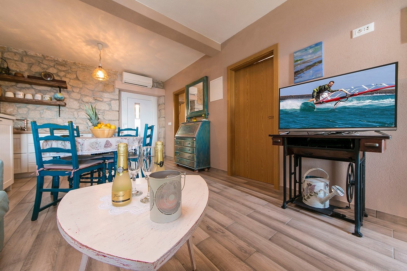 House can accommodate 4 guests. Beds are situated in 1 sleeping rooms, but also in the living room, within 39m2. Guests can use a private terrace to enjoy the warm summer evenings. The house offers the sea view. For full enjoyment and relaxation there is a private barbecue for this accommodation guests only. This accommodation unit welcomes pets at an additional charge. Notthe rooms of the booked accommodation unit are connectedone whole. INCLUDED IN THE PRICE: tourist tax, final cleaning, air-conditioning, parking, internet, iron, ironing board, hairdryer. OPTIONAL ADDITIONAL COSTS: pets (€10.00 per night). The availability of additional services for your chosen dates of stay, as well as their prices (if none are listed) must be checked ahead of time. Any additional services not shown in the price calculation are payable directly to the property owner and only if used by the visitor.