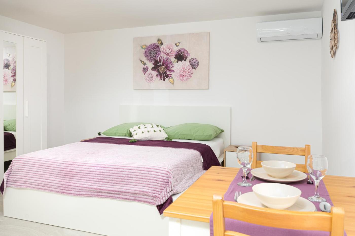 Studio Apartment. Featuring a private entrance, this air-conditioned apartment is comprised of 1 living room, 1 separate bedroom and 1 bathroom with a shower. Guests will find a stovetop, a refrigerator, kitchenware and an electric kettle in the fully equipped kitchen. The apartment also has a barbecue. Boasting a terrace with garden views, this apartment also offers soundproof walls and a flat-screen TV with satellite channels. The unit offers 4 beds.