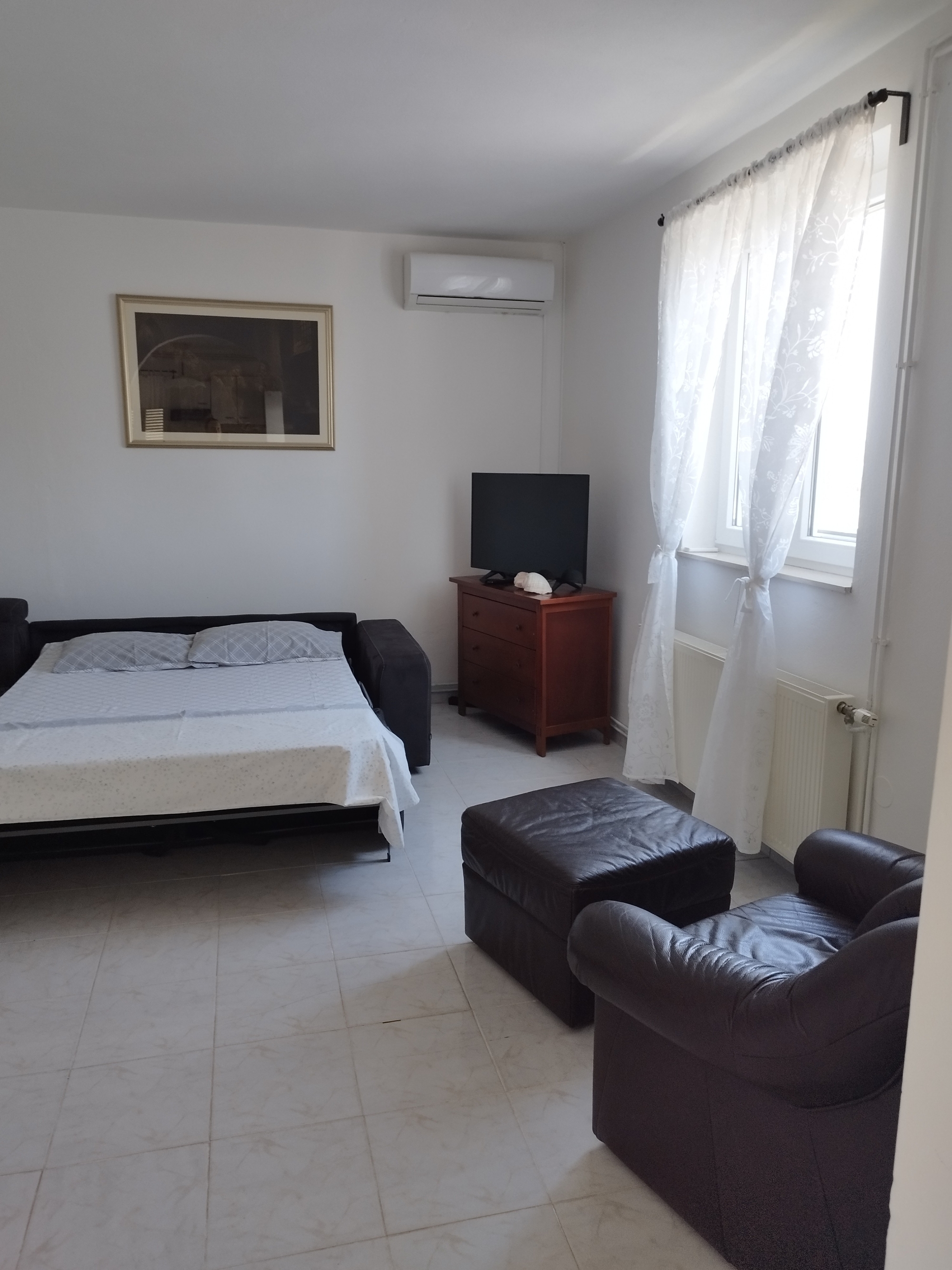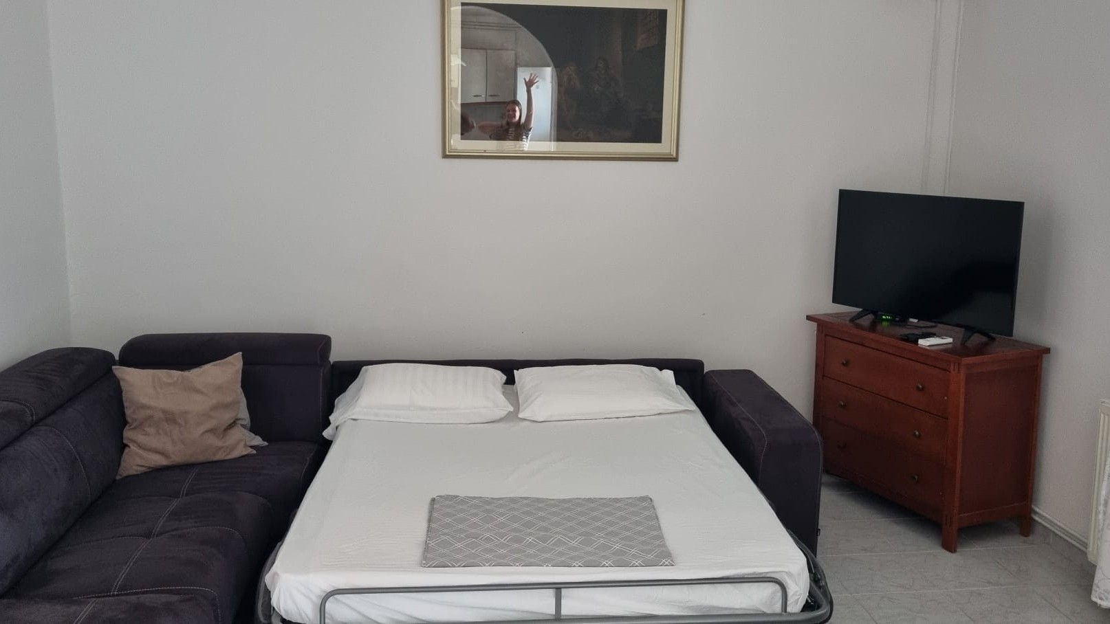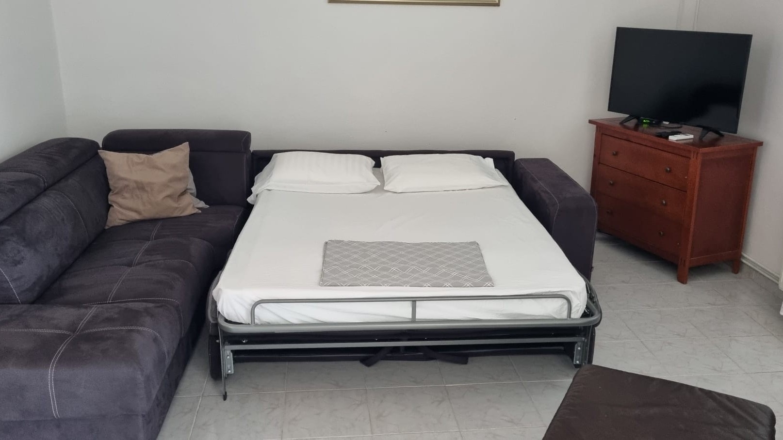 Apartment can accommodate 4 guests. Beds are situated in 1 sleeping rooms, but also in the living room, within 54m2. Guests can use a private terrace to enjoy the warm summer evenings. The apartment offers the sea view. Food can be prepared using barbecue which is shared with other guests too. INCLUDED IN THE PRICE: tourist tax, final cleaning, air-conditioning, parking, internet, baby cot, hairdryer. OBLIGATORY ADDITIONAL COSTS: short stay fee (surcharge depending on a number of booked nights: 30% - 1, 20% - 2, 10% - 3). OPTIONAL ADDITIONAL COSTS: additional bed (€5.00 per night). The availability of additional services for your chosen dates of stay, as well as their prices (if none are listed) must be checked ahead of time. Any additional services not shown in the price calculation are payable directly to the property owner and only if used by the visitor.