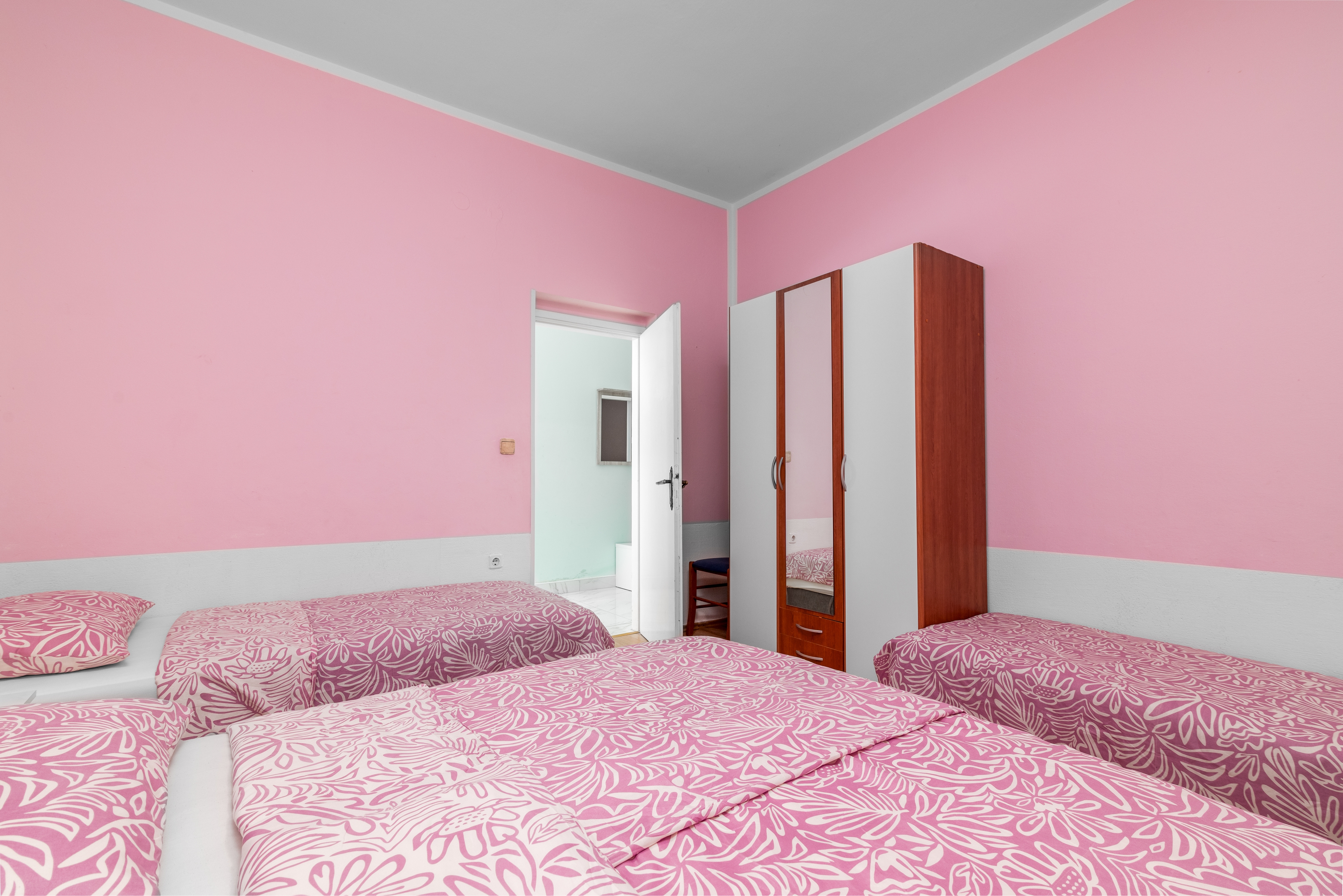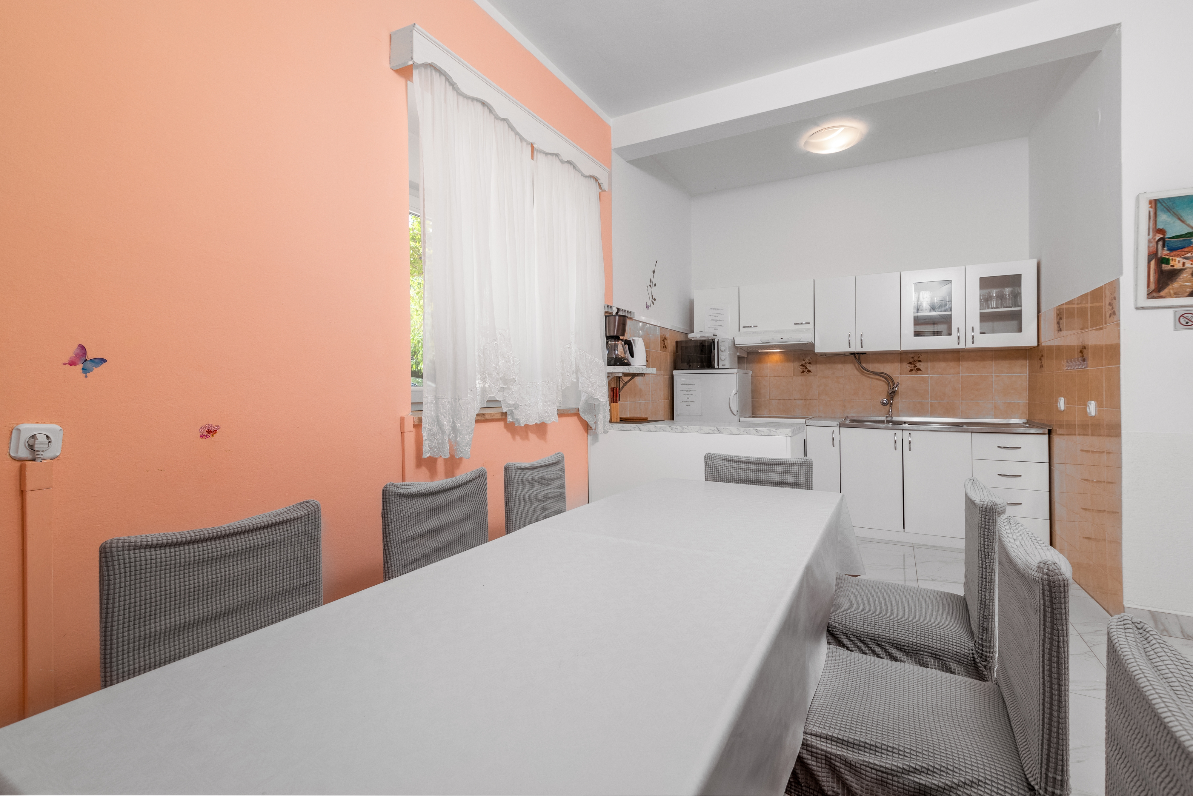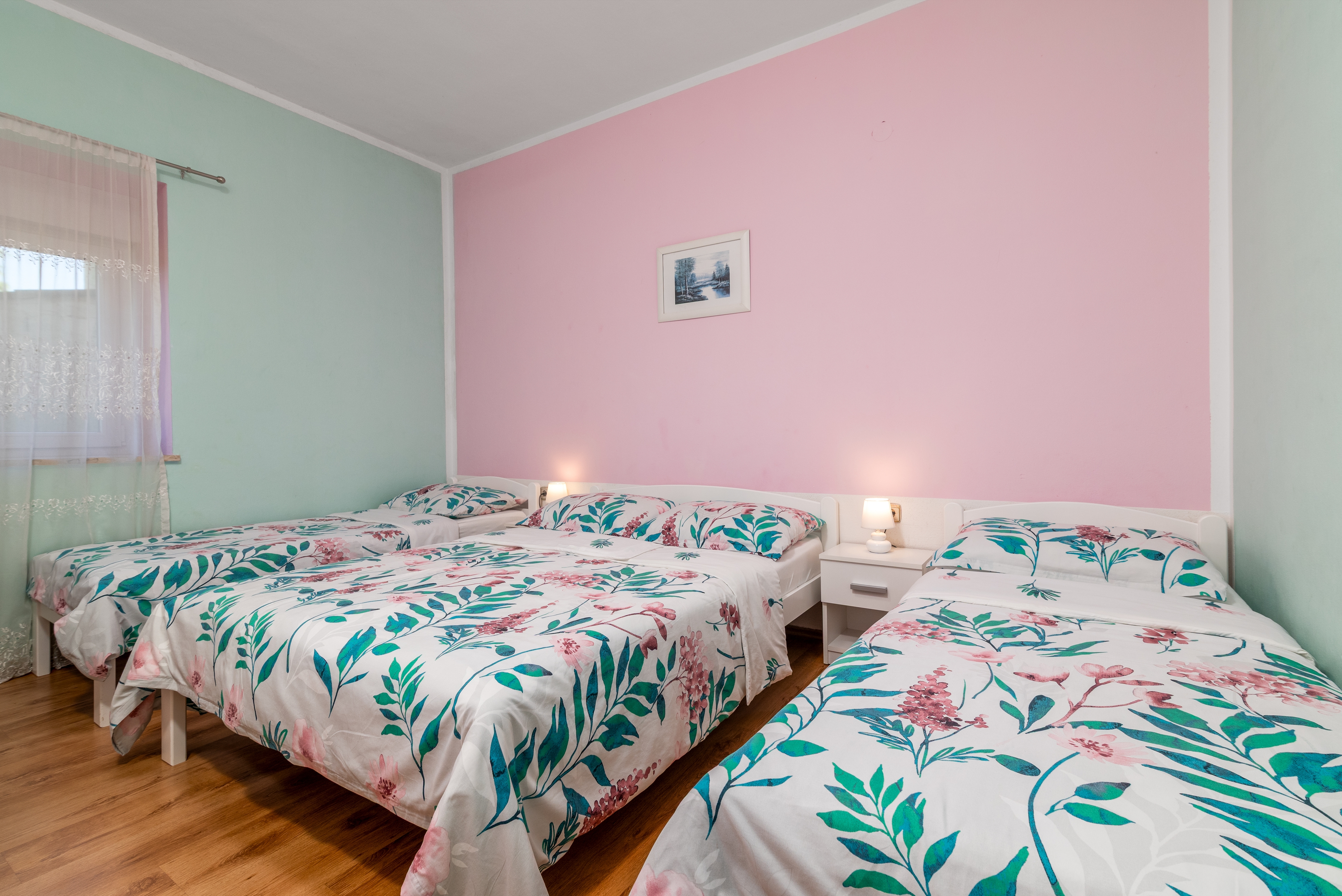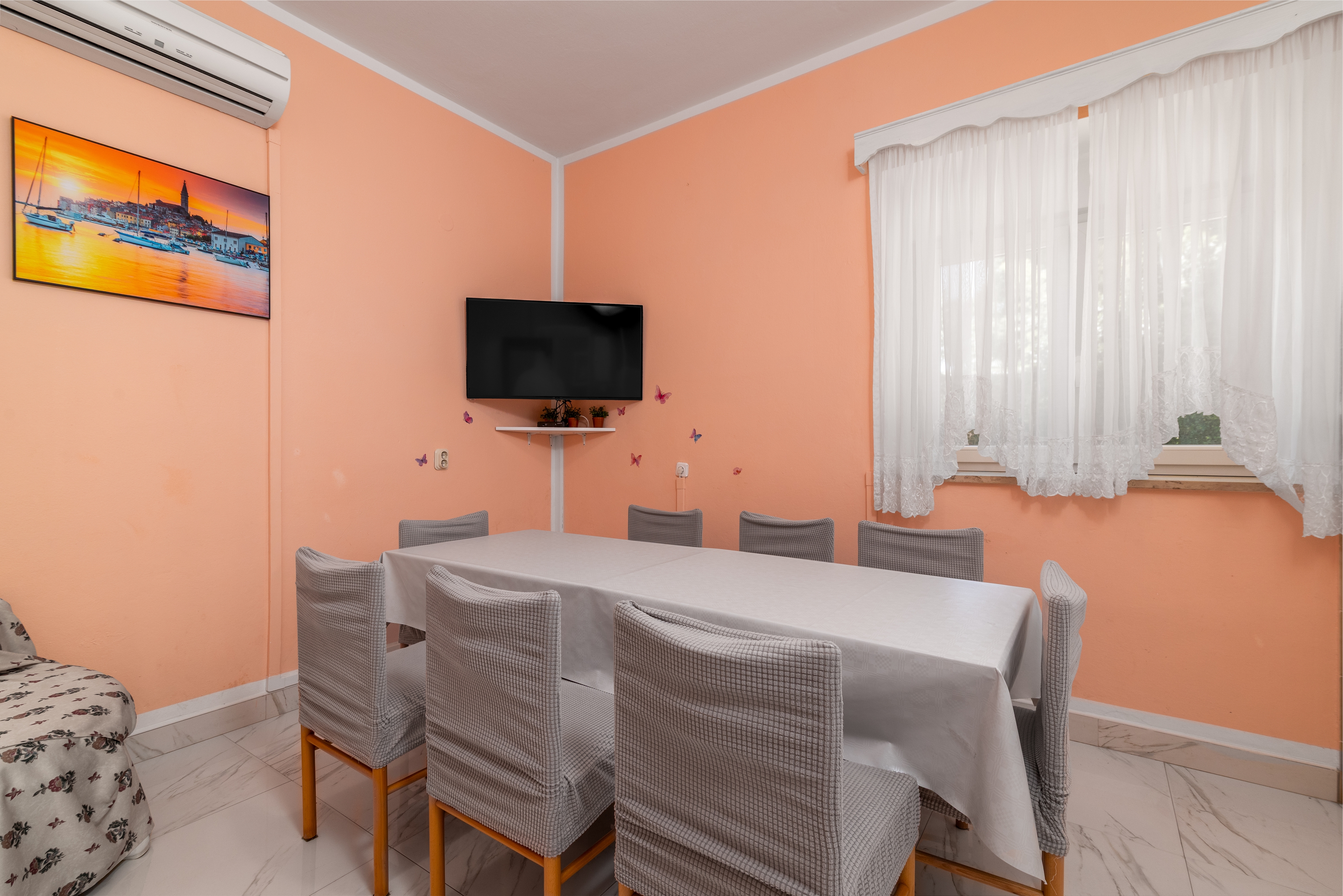 Apartment can accommodate 9 guests. Beds are situated in 2 sleeping rooms, but also in the living room, within 71m2. Guests can use a private terrace to enjoy the warm summer evenings. Food can be prepared using barbecue which is shared with other guests too. Shared pool is on disposal during stay. This accommodation unit welcomes pets at an additional charge. For the booked accommodation unit the deposit is paid directly to the owner upon check-in (deposit amount is displayed on the website) INCLUDED IN THE PRICE: tourist tax, final cleaning, air-conditioning, pool, parking, internet, baby cot, iron, ironing board, hairdryer, portable barbecue, sunshade, sunchairs. OBLIGATORY ADDITIONAL COSTS: deposit (€100.00 one-time payment). OPTIONAL ADDITIONAL COSTS: laundry (€5.00 washing), pets (€10.00 per night). The availability of additional services for your chosen dates of stay, as well as their prices (if none are listed) must be checked ahead of time. Any additional services not shown in the price calculation are payable directly to the property owner and only if used by the visitor. Discounts to the base price: free day 14=13 (for reservations of 14 or more days you get one free day for the stay until 31122026).