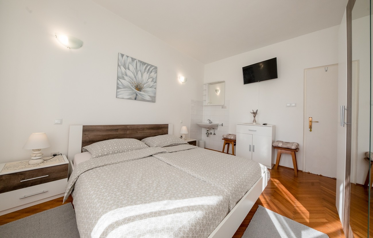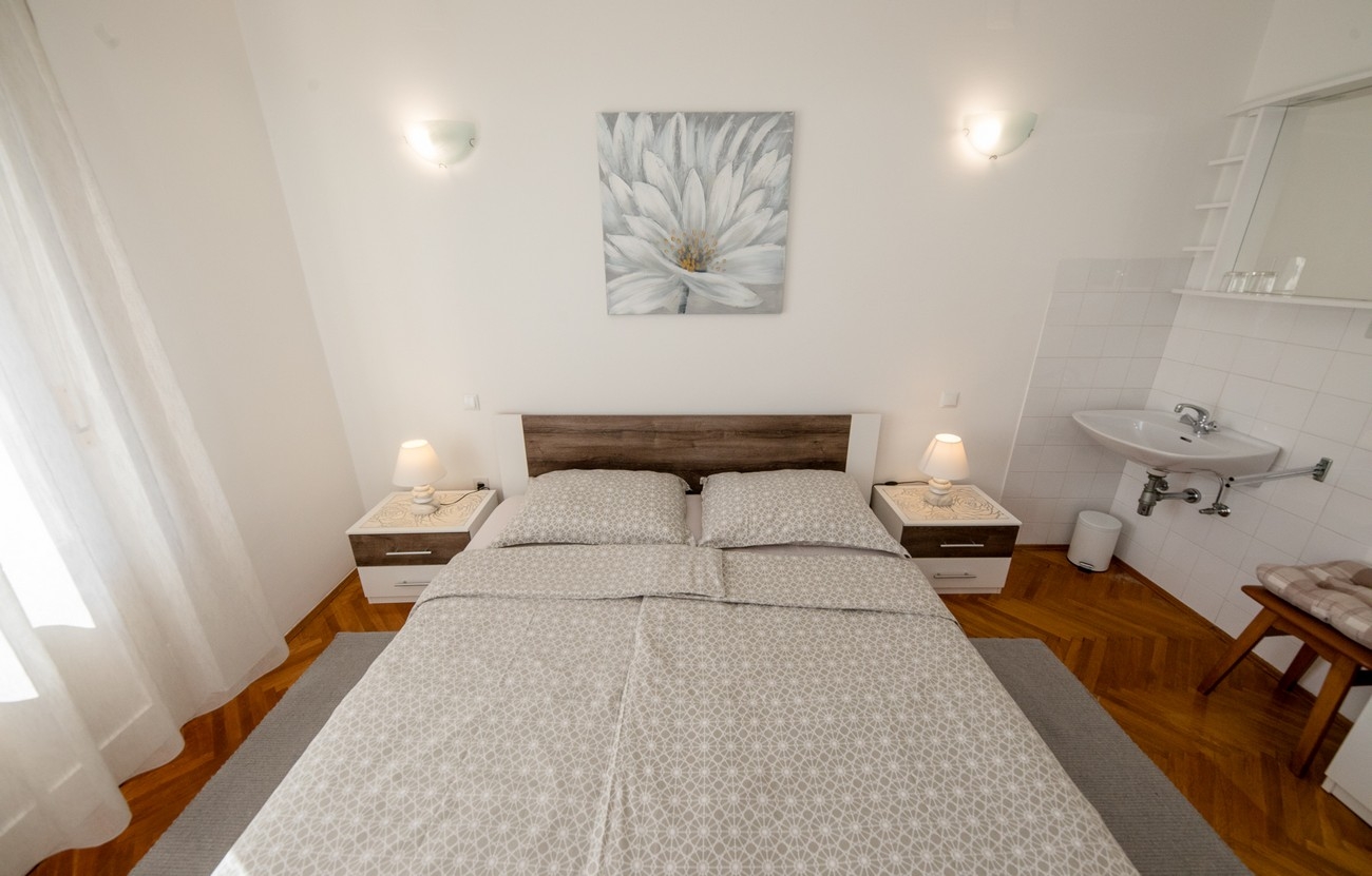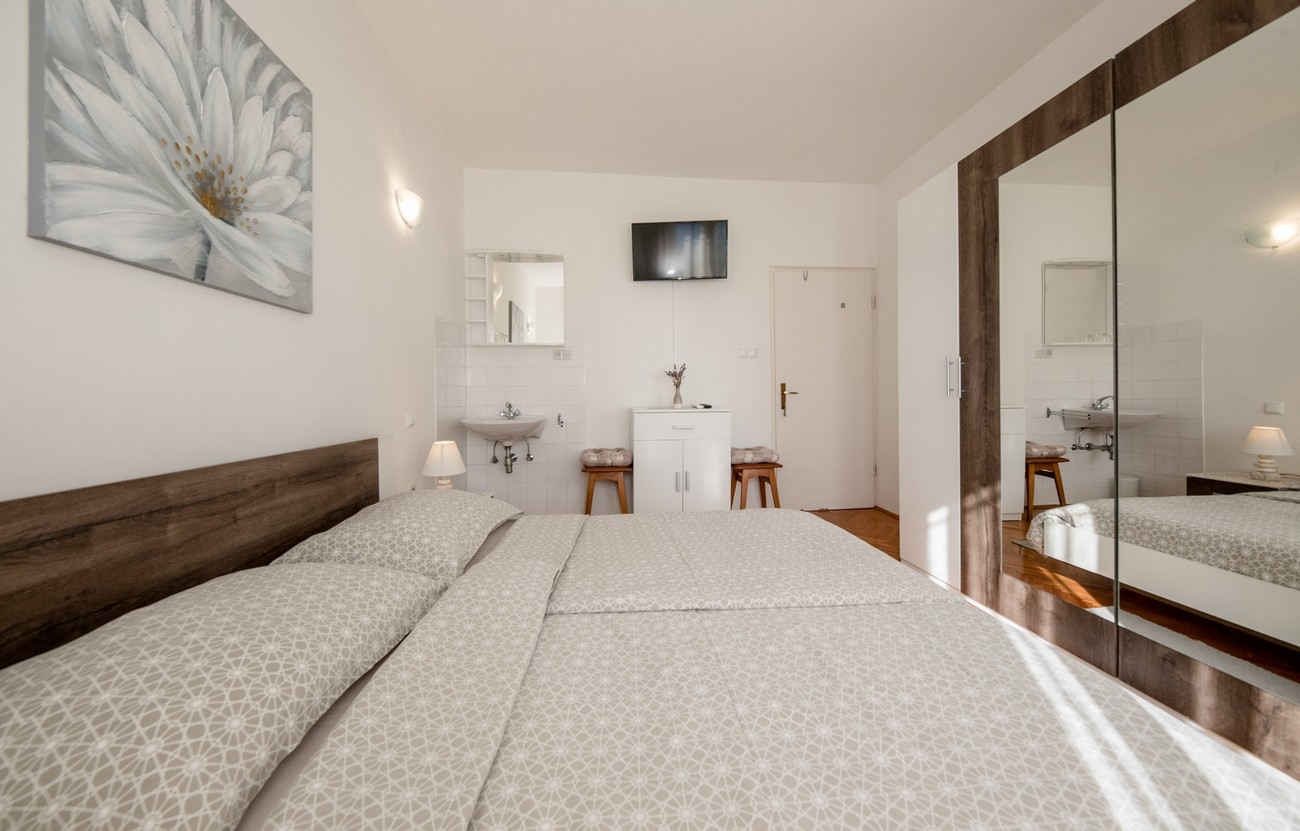 Room can accommodate 2 guests. Beds are situated in 1 sleeping rooms, within 21m2. Guests can use a private balcony to enjoy the warm summer evenings. The room offers the sea view. Food can be prepared using barbecue which is shared with other guests too. This accommodation unit welcomes pets at an additional charge. Reserved accommodation unit is a room with its own bathroom and there is no usage of kitchen. INCLUDED IN THE PRICE: tourist tax, final cleaning, air-conditioning, central heating, parking, internet. OBLIGATORY ADDITIONAL COSTS: short stay fee (surcharge depending on a number of booked nights: 30% - 1, 20% - 2, 10% - 3). OPTIONAL ADDITIONAL COSTS: breakfast (€10.00, a 50% discount for children aged 4 to 12 years, Children up to age 4 free of charge), laundry (€5.00 washing), boat mooring (€5.00 per night), pets (€10.00 per night). The availability of additional services for your chosen dates of stay, as well as their prices (if none are listed) must be checked ahead of time. Any additional services not shown in the price calculation are payable directly to the property owner and only if used by the visitor.