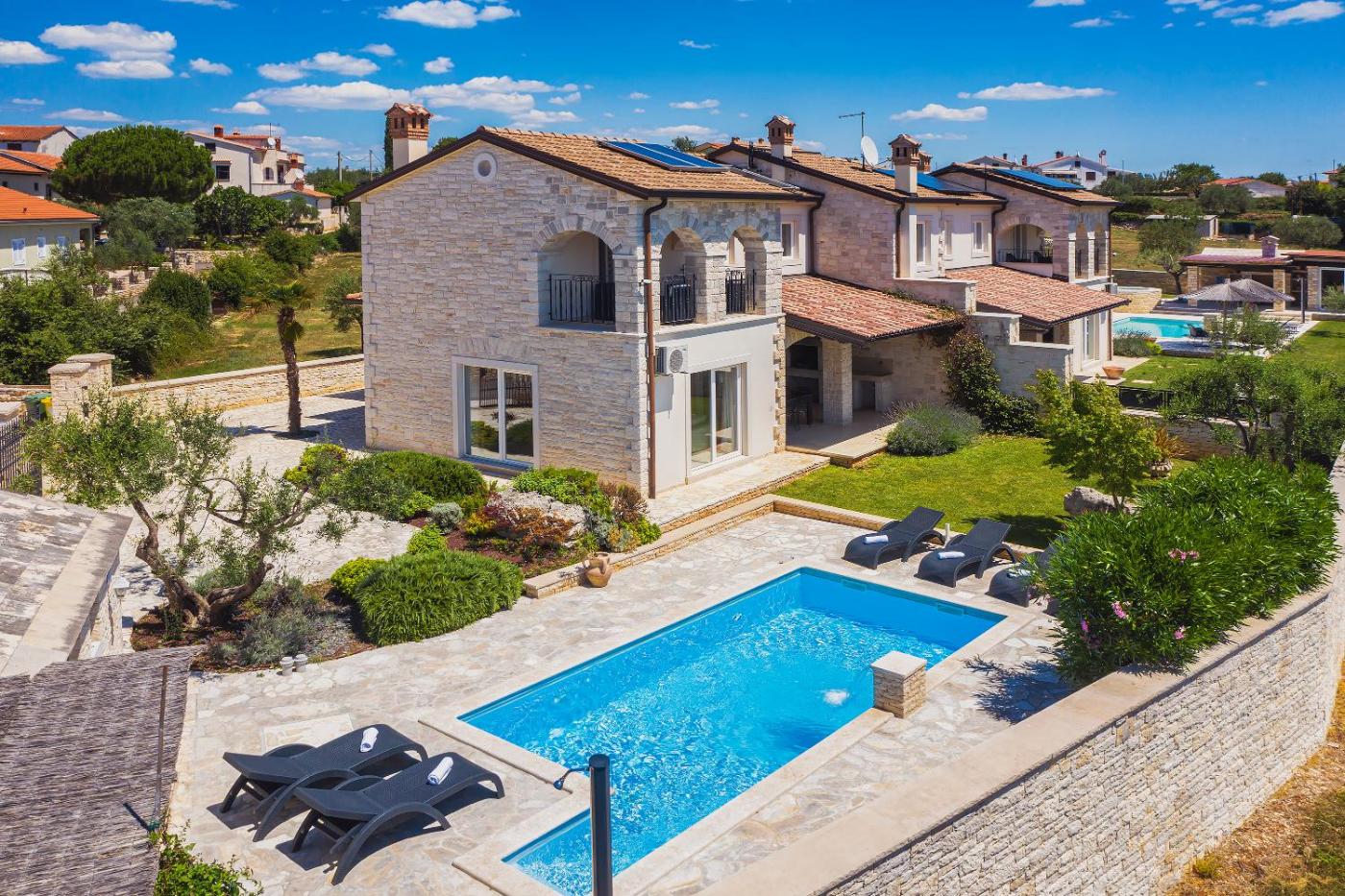 Three-Bedroom House with Private Pool. Featuring its private pool with sun loungers and parasols, this house is decorated with traditional stonewall elements and its surrounded by a garden. The air-conditioned interior is bright and comprises a fully equipped kitchen with a dishwasher and dining area and a living room with satellite TV. There are 2 bathrooms featuring a shower or a spa bath.