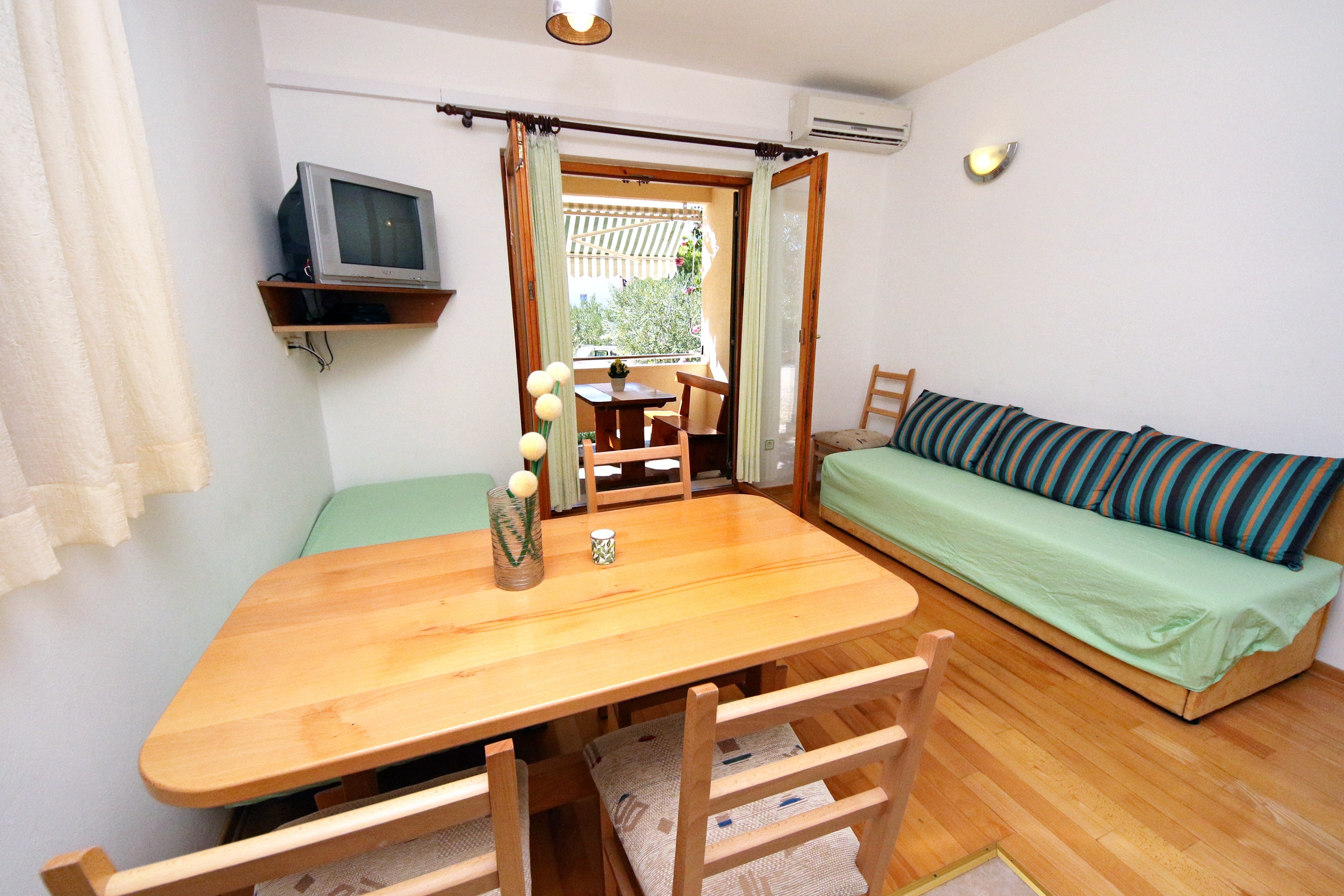 Apartment can accommodate 4 guests. Beds are situated in 1 sleeping rooms, but also in the dining room, within 30m2. Guests can use a private terrace to enjoy the warm summer evenings. Food can be prepared using barbecue which is shared with other guests too. INCLUDED IN THE PRICE: tourist tax, final cleaning, air-conditioning, parking, internet, laundry, baby cot, iron, ironing board, hairdryer. OBLIGATORY ADDITIONAL COSTS: short stay fee (surcharge depending on a number of booked nights: 30% - 1, 20% - 2, 10% - 3). OPTIONAL ADDITIONAL COSTS: boat mooring (€10.00 per night). The availability of additional services for your chosen dates of stay, as well as their prices (if none are listed) must be checked ahead of time. Any additional services not shown in the price calculation are payable directly to the property owner and only if used by the visitor. Discounts to the base price: free day 14=13 (for reservations of 14 or more days you get one free day for the stay until 31122026).