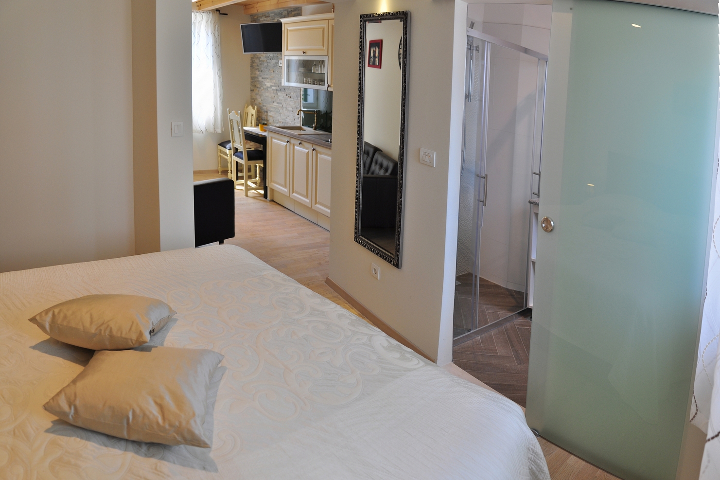 Studio flat can accommodate 2 guests. Beds are situated in 1 sleeping rooms, within 26m2. There is no balcony or terrace in the reserved accommodation unit. INCLUDED IN THE PRICE: tourist tax, final cleaning, air-conditioning, internet, iron, ironing board, hairdryer. The availability of additional services for your chosen dates of stay, as well as their prices (if none are listed) must be checked ahead of time. Any additional services not shown in the price calculation are payable directly to the property owner and only if used by the visitor. Discounts to the base price: free day 14=13 (for reservations of 14 or more days you get one free day for the stay until 31122026).