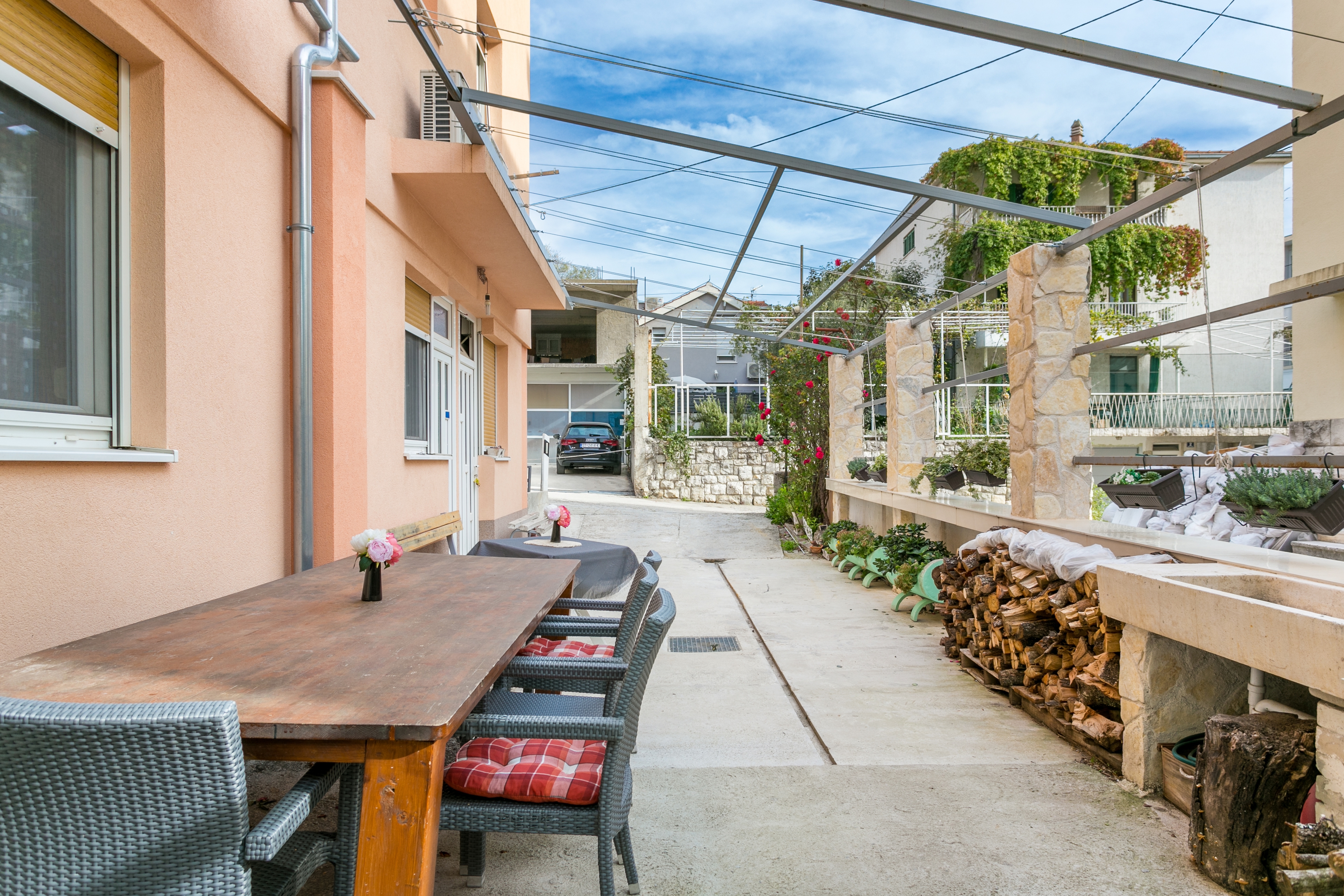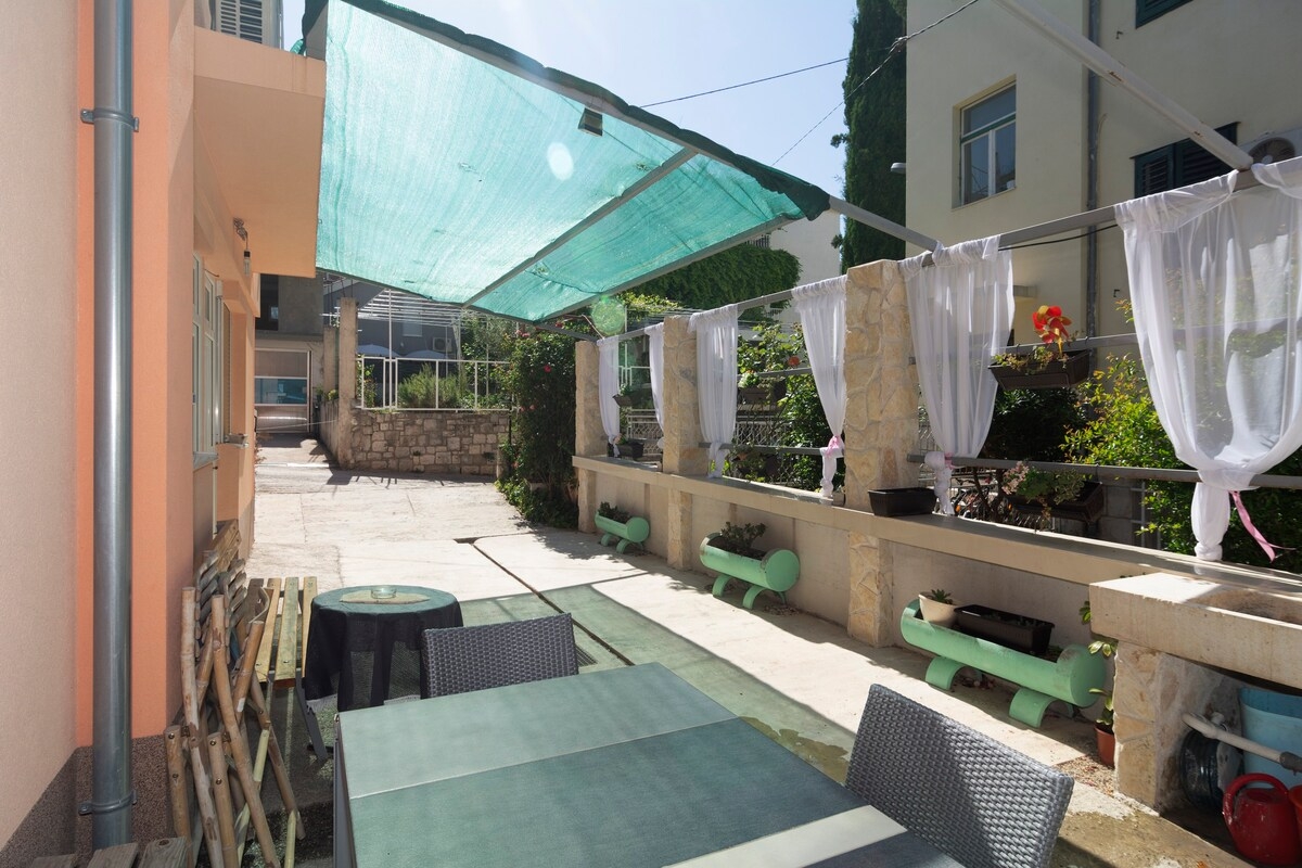 The house 14051 located in Split, Split - Central Dalmatia has accommodation units: Studio flat (2) and is 800 m away from the sea. The nearest beach is sand. As the house contains multiple apartments, the house will be shared with other guests. The owners will be in residence during your stay. The house owner is under no obligation to accept additional persons and pets that were not stated in the reservation request and it is necessary to report them in advance.AMENITIES Courtyard (50m2, Sitting area), Parking lot (Number of parking spaces: 2, Distance from the house: In the courtyard), Barbecue: shared, WiFi Internet LOCATION AND ACCESS Facility is situated near a local road Main road between the property and the beach Car access possible: Yes The facility is not located in quiet surroundings DISTANCES Sea: 800 m Beach: 800 m Center: 1 km Shop: 140 m Urgent medical care: 550 m Pharmacy: 50 m Exchange office: 80 m ATMBank machine: 90 m Tourist info: 600 m Airport: 26 km Ferry port: 1.3 km Bus station: 1.3 km Gas station: 180 m Farmers market: 950 m