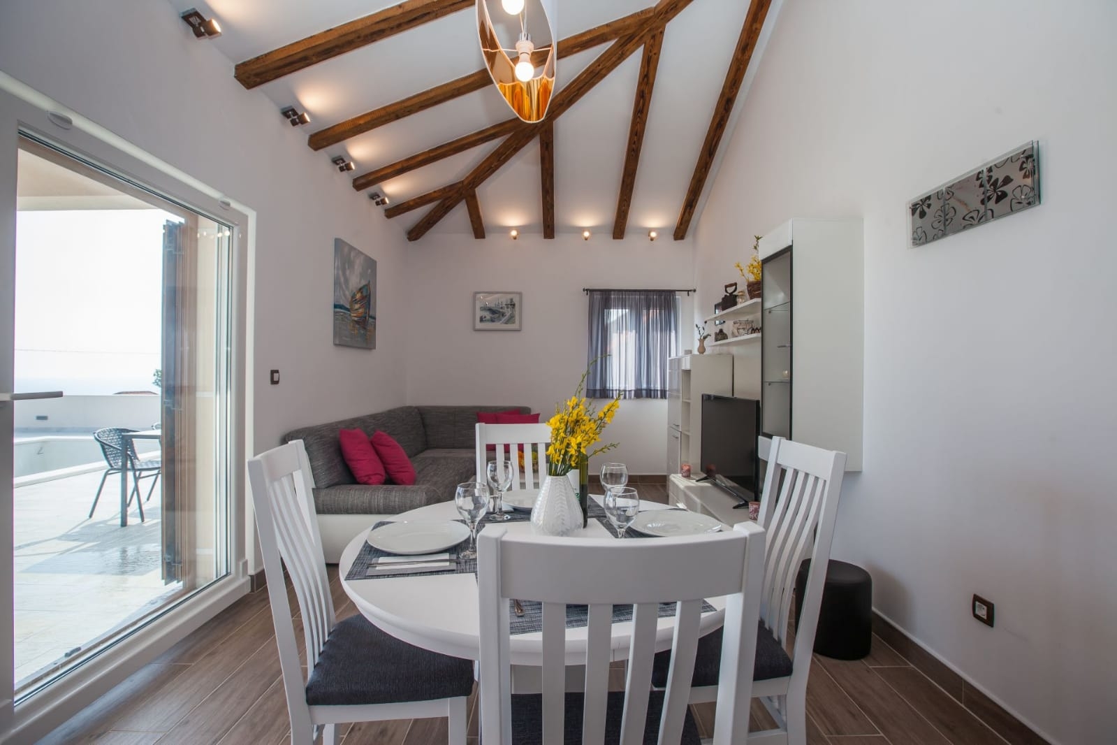 House can accommodate 6 guests. Beds are situated in 2 sleeping rooms, but also in the living room, within 52m2. Guests can use a private terrace to enjoy the warm summer evenings. The house offers the sea view. For full enjoyment and relaxation there is a private barbecue for this accommodation guests only. During stay, there is a private pool for relaxation and pleasure. INCLUDED IN THE PRICE: tourist tax, final cleaning, air-conditioning, pool, parking, internet, baby cot, iron, ironing board, hairdryer, sunshade, sunchairs. The availability of additional services for your chosen dates of stay, as well as their prices (if none are listed) must be checked ahead of time. Any additional services not shown in the price calculation are payable directly to the property owner and only if used by the visitor.
