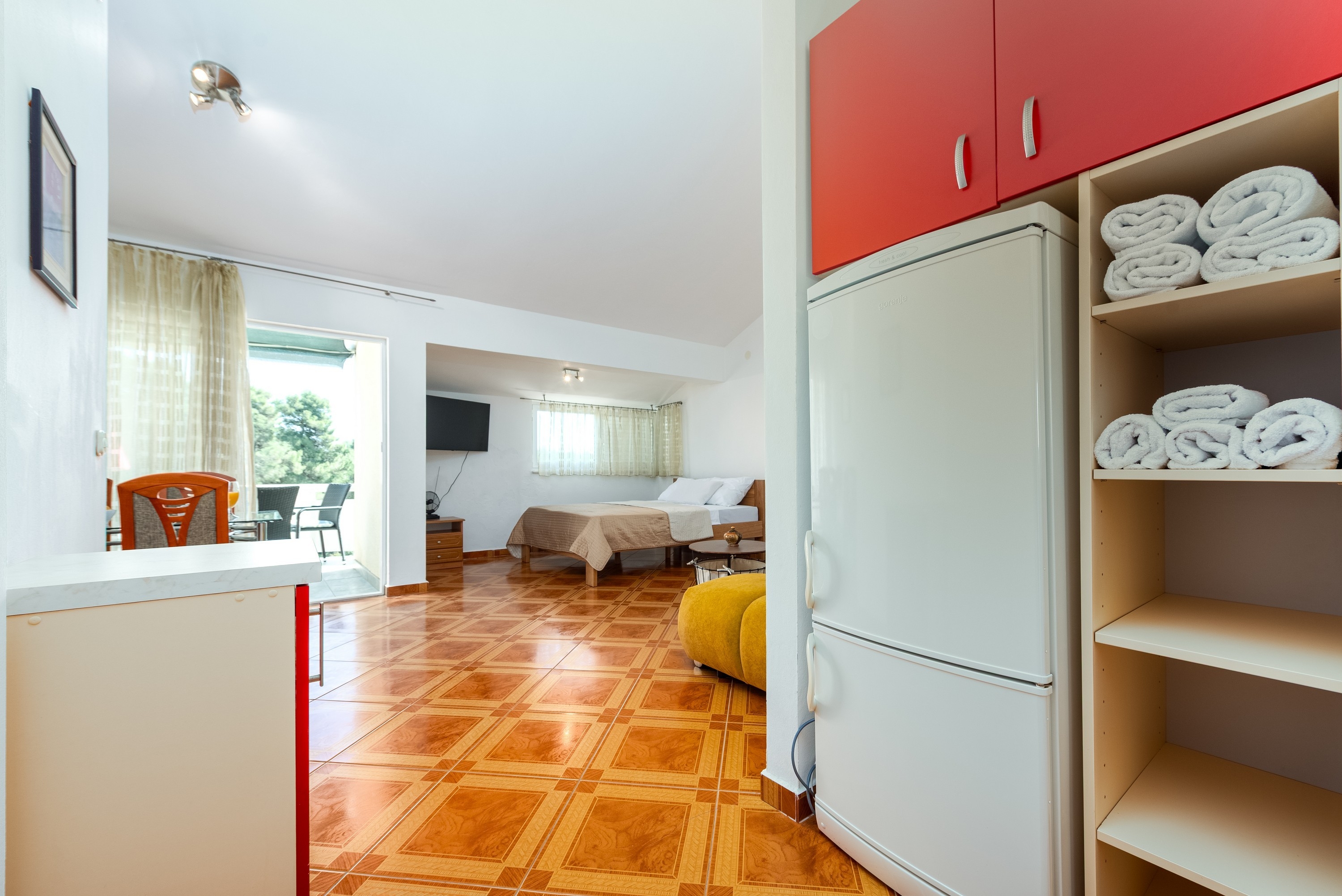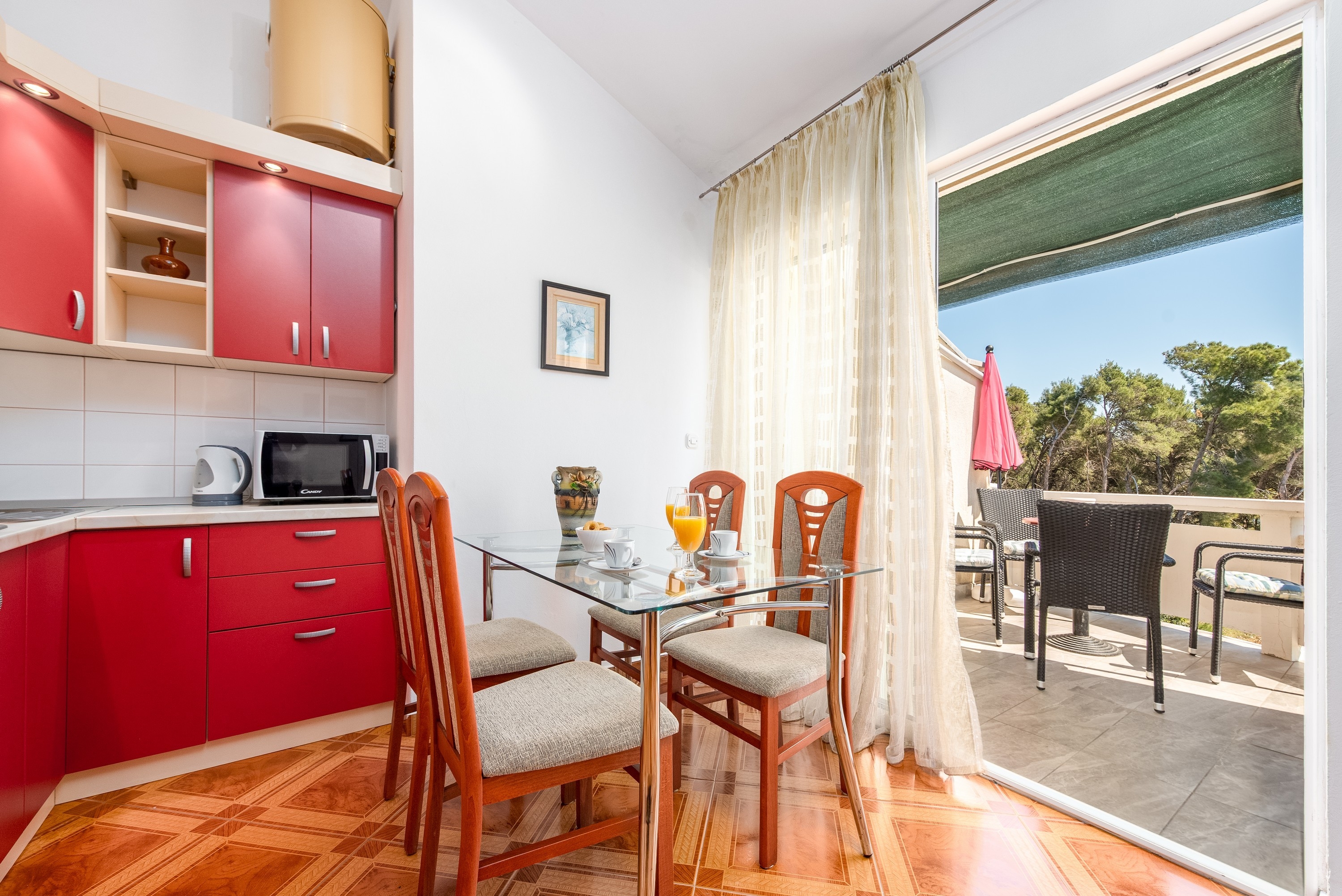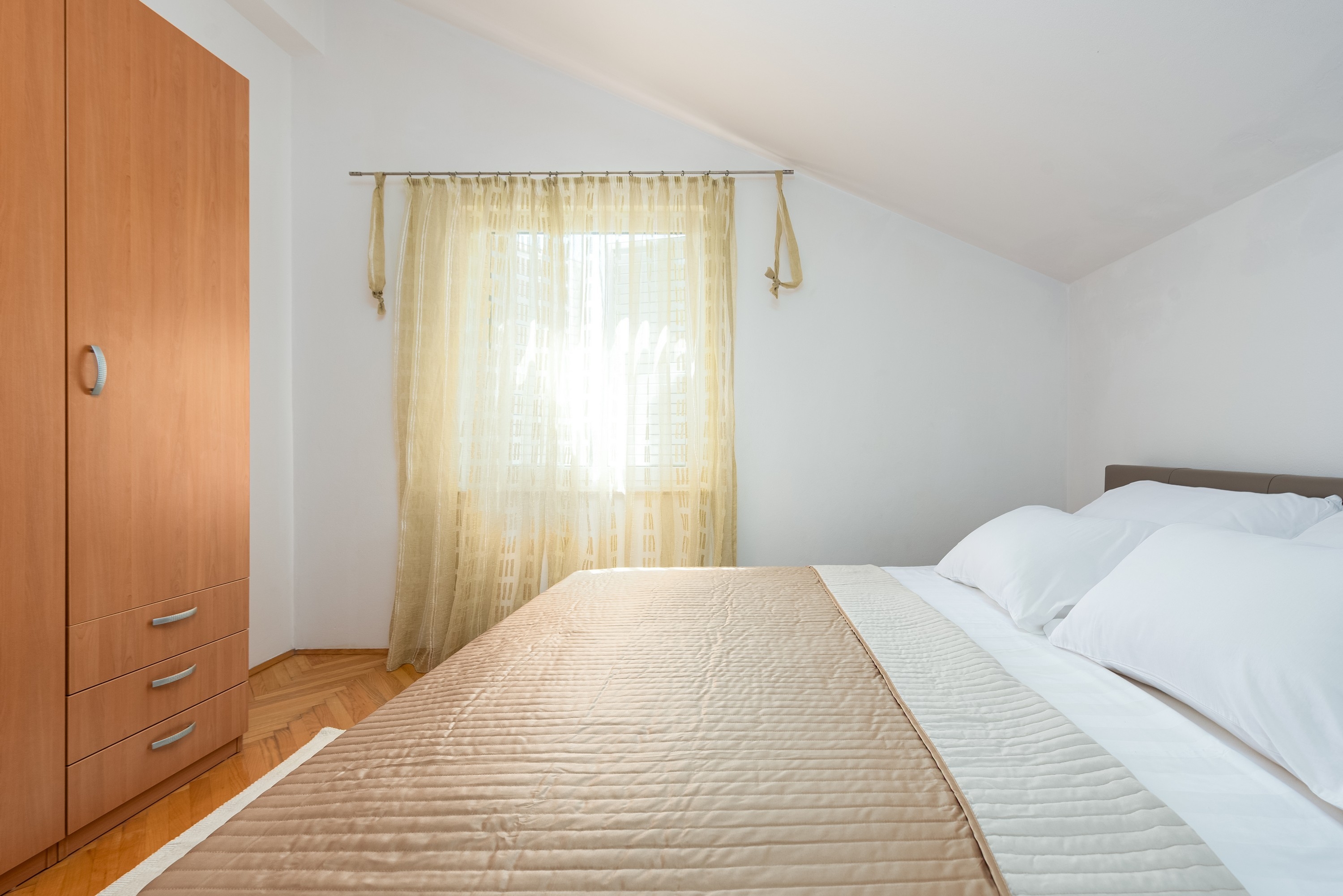Apartment can accommodate 4 guests. Beds are situated in 1 sleeping rooms, but also in the living room, within 60m2. Guests can use a private balcony to enjoy the warm summer evenings. The apartment offers the sea view. Food can be prepared using barbecue which is shared with other guests too. Shared pool is on disposal during stay. INCLUDED IN THE PRICE: tourist tax, final cleaning, air-conditioning, pool, parking, internet, baby cot, hairdryer, sunshade, sunchairs. OBLIGATORY ADDITIONAL COSTS: short stay fee (surcharge depending on a number of booked nights: 30% - 1, 20% - 2, 10% - 3). The availability of additional services for your chosen dates of stay, as well as their prices (if none are listed) must be checked ahead of time. Any additional services not shown in the price calculation are payable directly to the property owner and only if used by the visitor.
